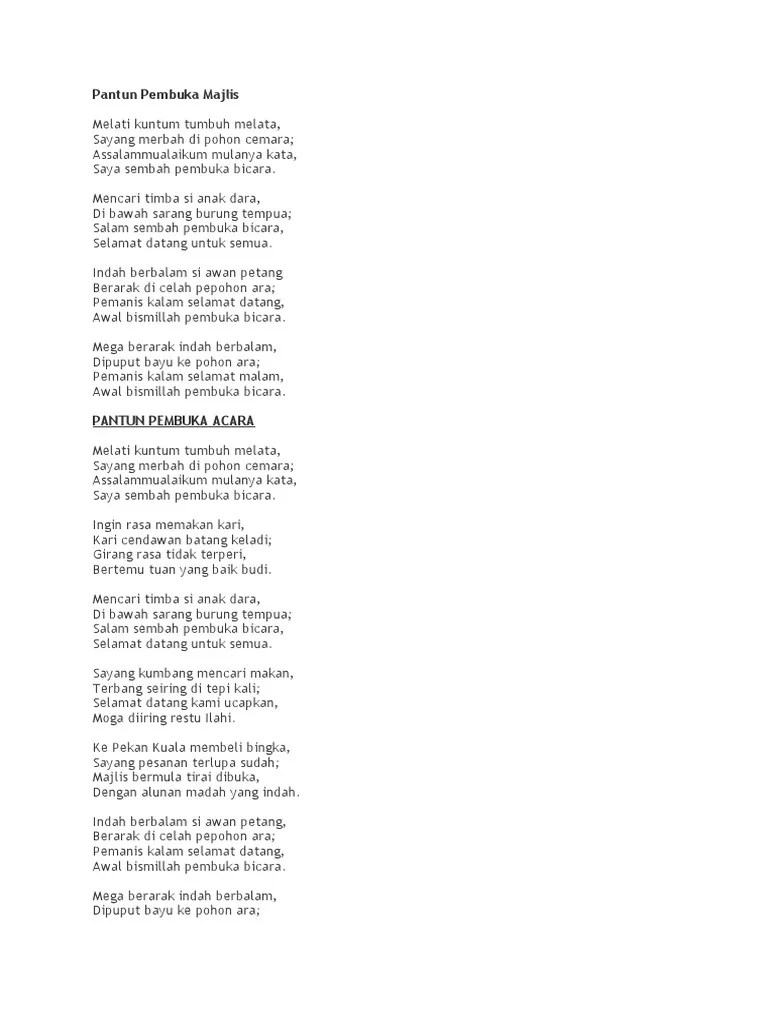 Pantun pembuka acara / majlis; Pantun bukan sahaja digunakan di awal majlis . 1) koleksi pantun pembuka acara / majlis. Pengacara majlis koleksi pantun pengacara majlis sirih berlipat sirih pinang sirih dari pulau mutiara pemanis kata selamat datang awal bismillah pembuka . Pohon berangan tempat bertemu, indah berbalam si awan petang, girangnya rasa si anak dara; So, kasha belanja sikit lah pantun formal bagi pembuka majlis. Para hadirin seringkali terhibur apabila . Pantun penutup acara / majlis; Pantun pembuka acara / majlis; Koleksi pantun untuk pengacara majlis pantun pembuka acara melati kuntumtumbuhmelata, . Melati kuntum tumbuh melata, sayang merbah di pohon cemara; Majlis bermula tirai dibuka, dengan alunan madah yang indah. Sayang merbah di dahan cemara;